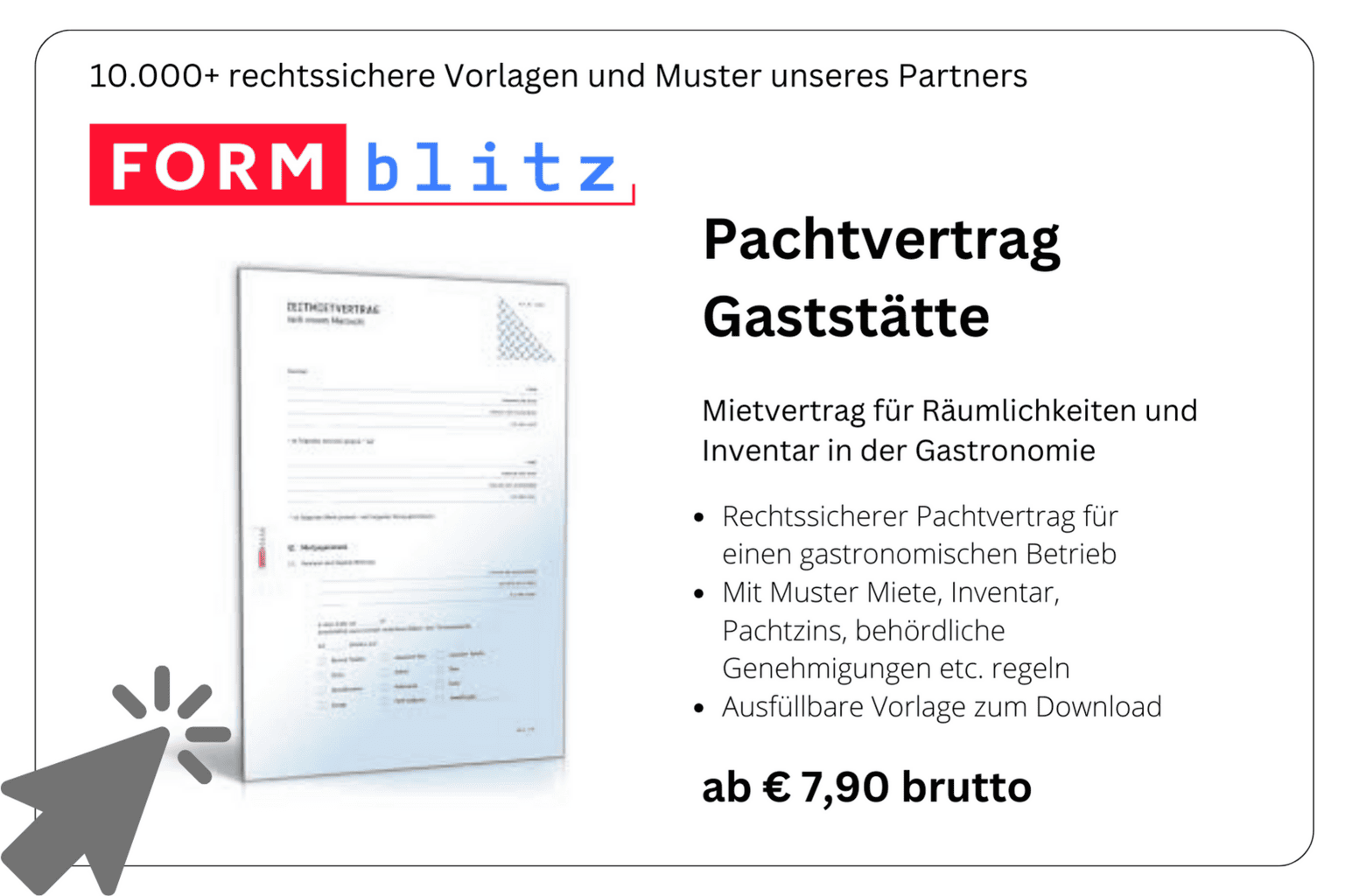 Hinweis: Ich empfehle für Ihren Pachtvertrag Gastronomie dringend die Vereinbarung für einen Deckel nach oben. Angenommen Ihre Geschäfte laufen so gut, dass Sie sehr hohe Summen an den Verpächter abführen müssen. Das wäre sehr ärgerlich, wenn dieser auch mit weniger zufrieden gewesen wäre!