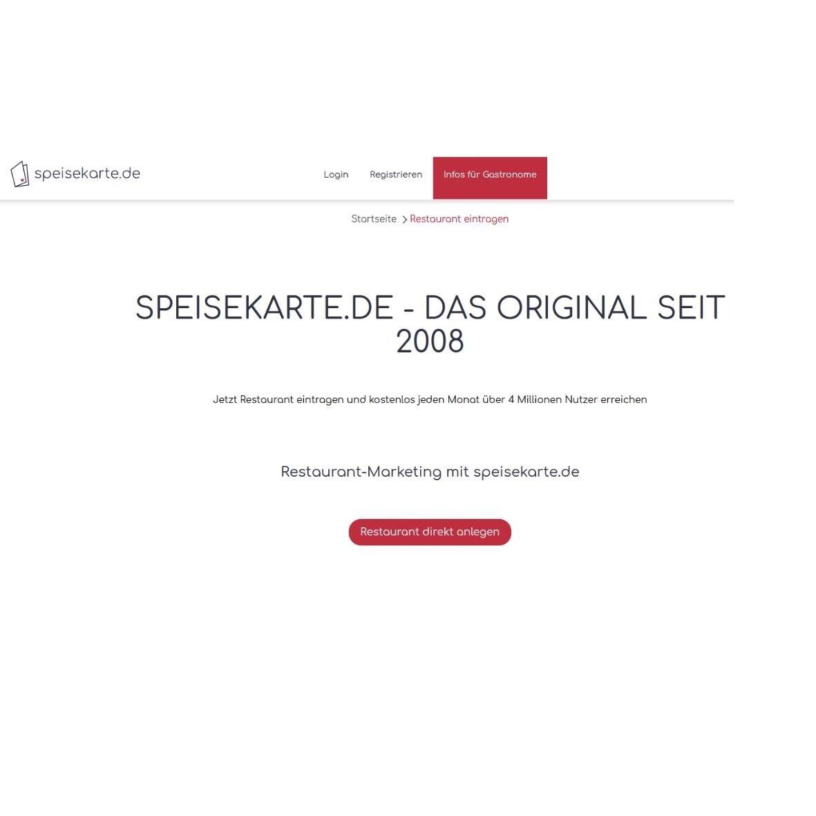 Unter speisekarte.de können Sie Ihr Restaurant kostenlos eintragen und Ihre Speisekarte einpflegen. Diese können Sie dann auf Ihrer eigenen Website oder auf Facebook verfügbar machen.